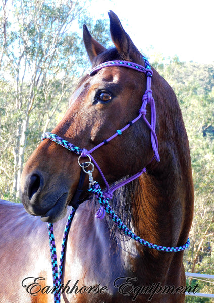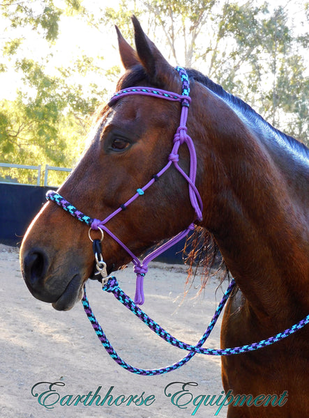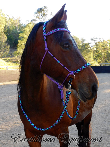 *Sliding chin riding halter/bitless bridle and reins set in Purple with "Northern Lights" padding/inset and round rope reins.